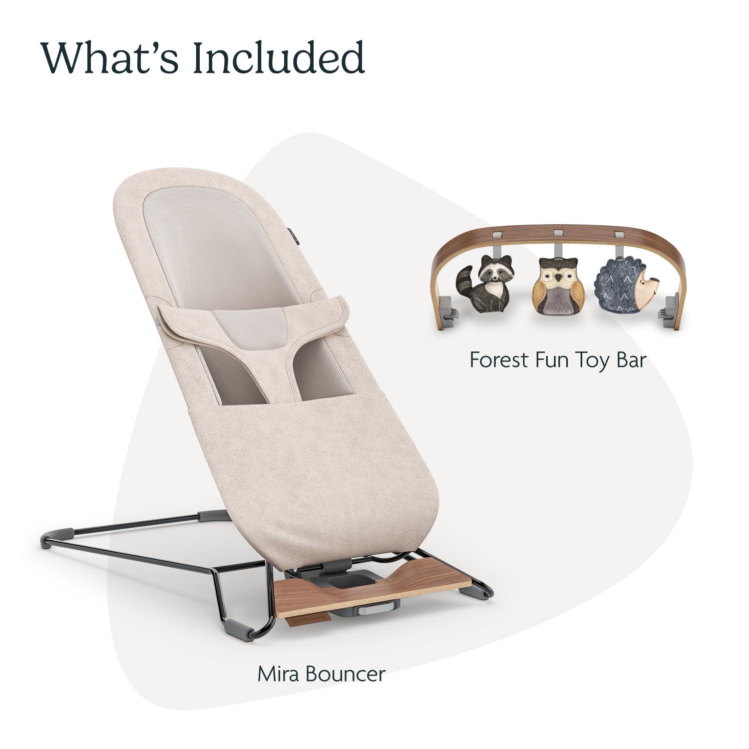 UPPAbaby Mira Bouncer Bundle, Includes Mira 2-in-1 Bouncer and Forest Fun Toy Bar, Seat Grows with Your Baby, Folds Flat, Sensory Entertainment – Stella (Grey Mélange)(Charlie (Sand Mélange))