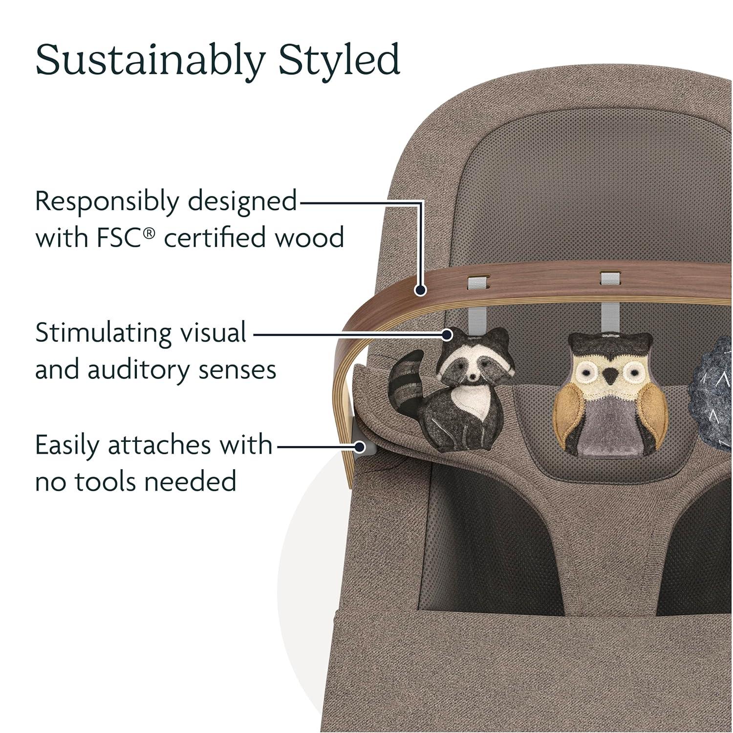 Cozy, Calming, Comfort.™ A cozy place to play or lay, the Mira was designed to soothe and comfort baby while keeping them close. Following their natural movement, the 2-in-1 bouncer and seat gently rocks to their rhythm from newborn to toddler. Fun forest friends support cognitive milestones by engaging baby’s curiosity during play. Animals spin, squeak, jingle and crinkle stimulate visual, auditory senses. Close for baby to reach for, twirl and grasp. Attaches easily to bouncer Folds with bouncer. Toy Bar Accessories for fine motor development and hand-eye coordination.