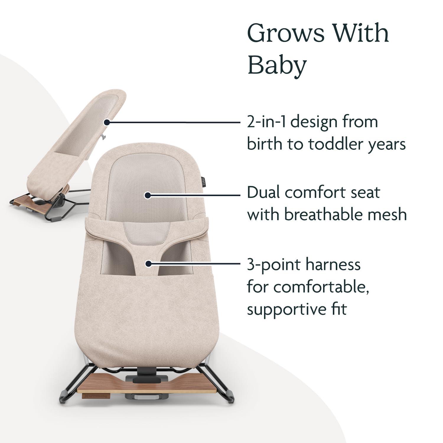 ROCKS TO THEIR RHYTHM: A cozy place to play or lay, the Mira was designed to soothe and comfort baby while keeping them close. Following their natural movement, the 2-in-1 bouncer and seat gently rocks to their rhythm from newborn to toddler.